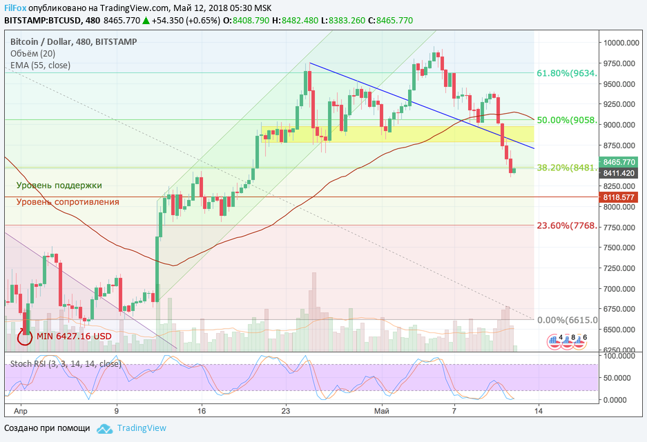 Вчера падение Bitcoin было столь стремительное, что цена пробила нижнюю границу желтого коридора предполагаемой консолидации и без отката продолжала снижение, пока не встретила поддержку на уровне 38.2% фибо (8481.00 USD).