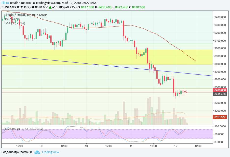 Похоже, что этот уровень немного замедлил падение пары BTC/USD и цена, в течении последних семи часов, пытается консолидироваться. Установив минимум на отметке 8 351.00 USD, цена восстанавливаясь, несколько раз, ре-тестила уровень 38.2% фибо (8481.00 USD), но пробить его снизу вверх пока не удалось. Вот как это выглядит на часовом тайм-фрэйме.