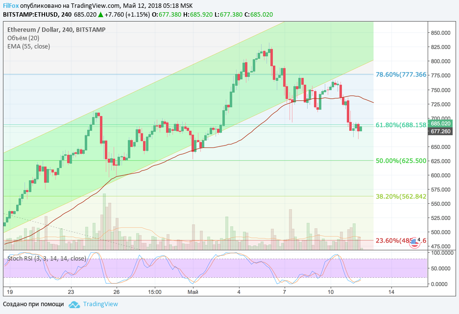 Ethereum вчера пытался сохранить свои позиции в области средних цен, но падение флагманской пары BTC/USD повлекло за собой и снижение эфира. Следует отметить, что динамика снижения ETH/USD была менее активной, чем у пары BTC/USD. Ethereum удалось на некоторое время заякорить уровень поддержки 61.8% фибо (688.16 USD) и переждать масштабные распродажи.