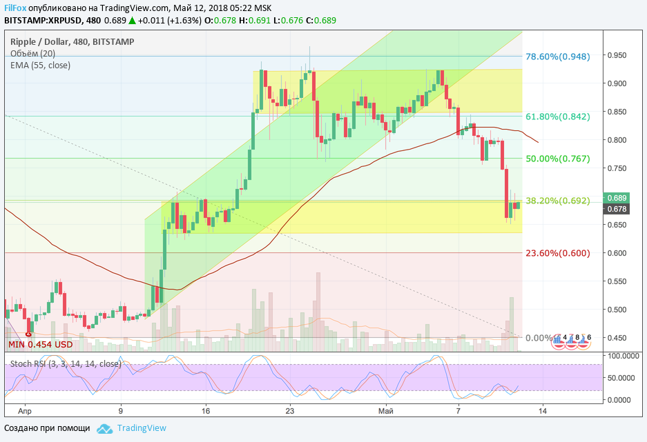 Ripple прекрасно «знал», где можно переждать первую волну распродаж и поэтому вчера почти сразу упал в желтый коридор для консолидации. Об этом коридоре знали и мы, поэтому так уверенно вчера строили прогнозы, однако сейчас полагаем, что долго пролежать на боку в этом желтом диапазоне риплу вряд ли удастся. Продолжение снижения пары BTC/USD опустит цену на XRP до уровня 23.6% фибо (0.600 USD)