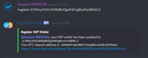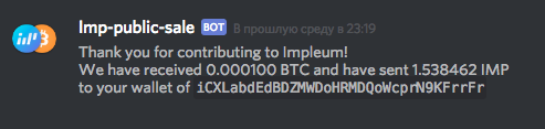 Продажа проходит в автоматическом режиме, монеты IMP будут отправлены на ранее зарегистрированный адрес Impleum кошелька после подтверждения транзакции. Уведомление о покупке придет в личном сообщении от бота Imp-public-sale.