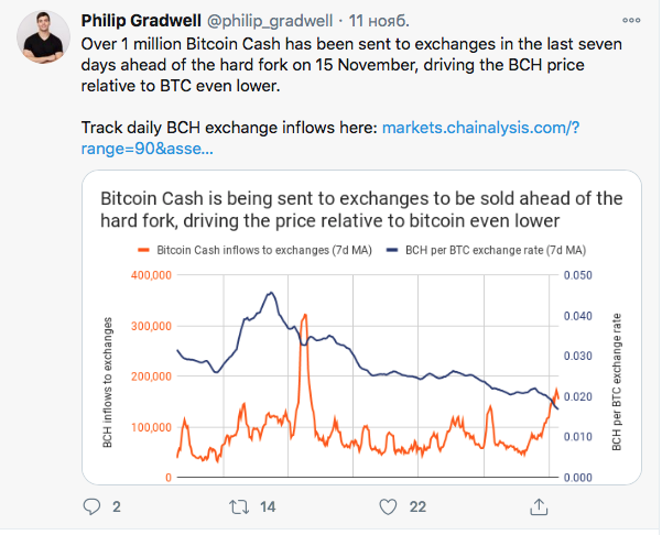 Филип Грэдуэлл, главный экономист Chainalysis, убежден, что таким образом пользователи пытаются избежать последствий возможного скачка волатильности BCH. Эта тенденция уже сильно ударила по цене BCH.