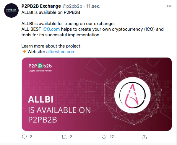 Биржа P2pb2b объявила о добавлении поддержки ALLBI 11 декабря. За считанные часы цена токена рванула вверх, увеличив его капитализацию с $4 тыс. до $1,4 млн.