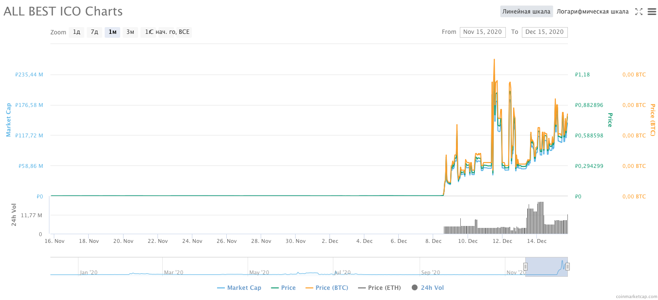 По данным coinmarketcap.com, сейчас ALLBI занимает 1037-ю строчку рейтинга, а ранее максимальный обьем продаж монеты составлял $500.