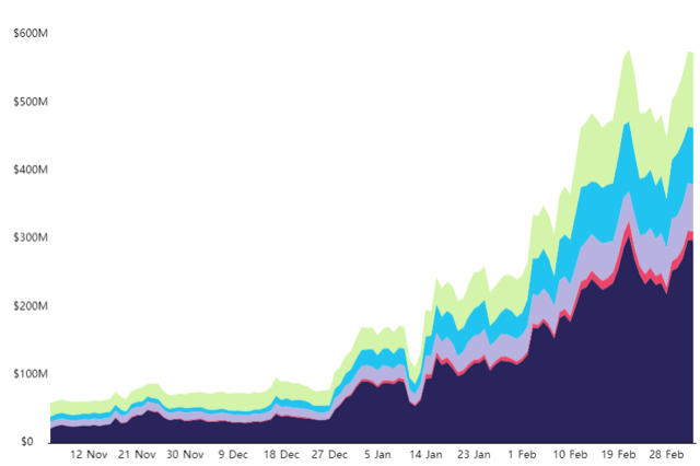 С начала года открытый интерес по фьючерсам DOT вырос на 690% до 575 миллионов долларов, став четвертым по величине рынком деривативов после биткойнов (BTC), эфира (ETH) и Cardano (ADA).