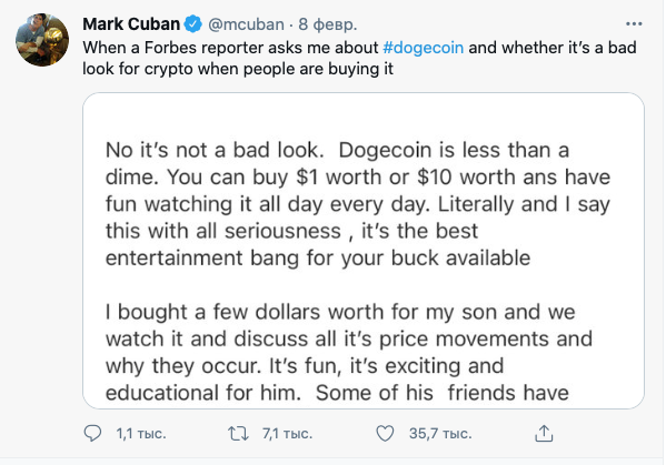 Легендарный инвестор часто публикует свое мнение о криптовалютах в Twitter. Совсем недавно он написал, что купил своему сыну DOGE, чтобы научить его инвестированию.