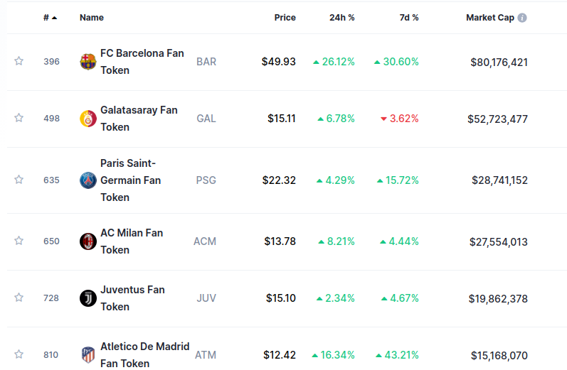 Примечательно, что не только CHZ, но и фанатские токены клубов начали резко расти в цене. За последние 7 дней цена токена ФК Барселона выросла на 30%, а цена Атлетико Мадрид на целых 43%.