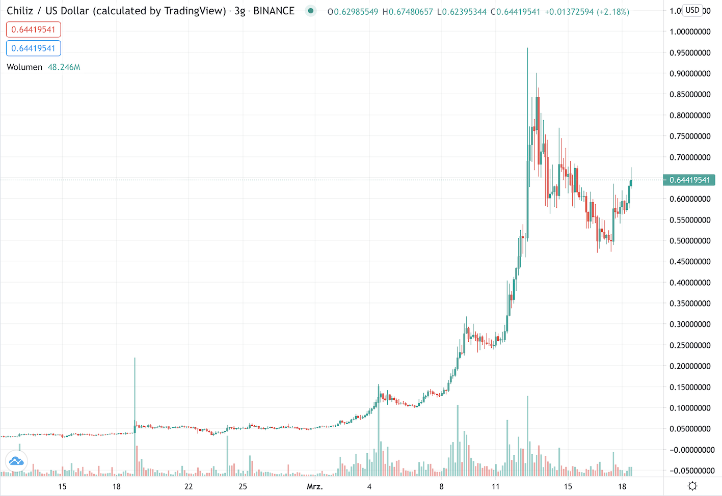 12 марта токен CHZ достиг рекордного уровня в $0.86. После небольшого отката цена CHZ консолидируется выше отметки $0,60.