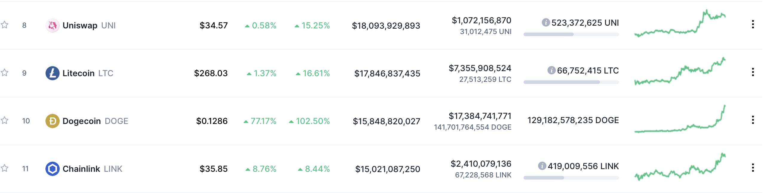 Агрессивные покупатели DOGE подняли актив на 10 место по капитализации.
