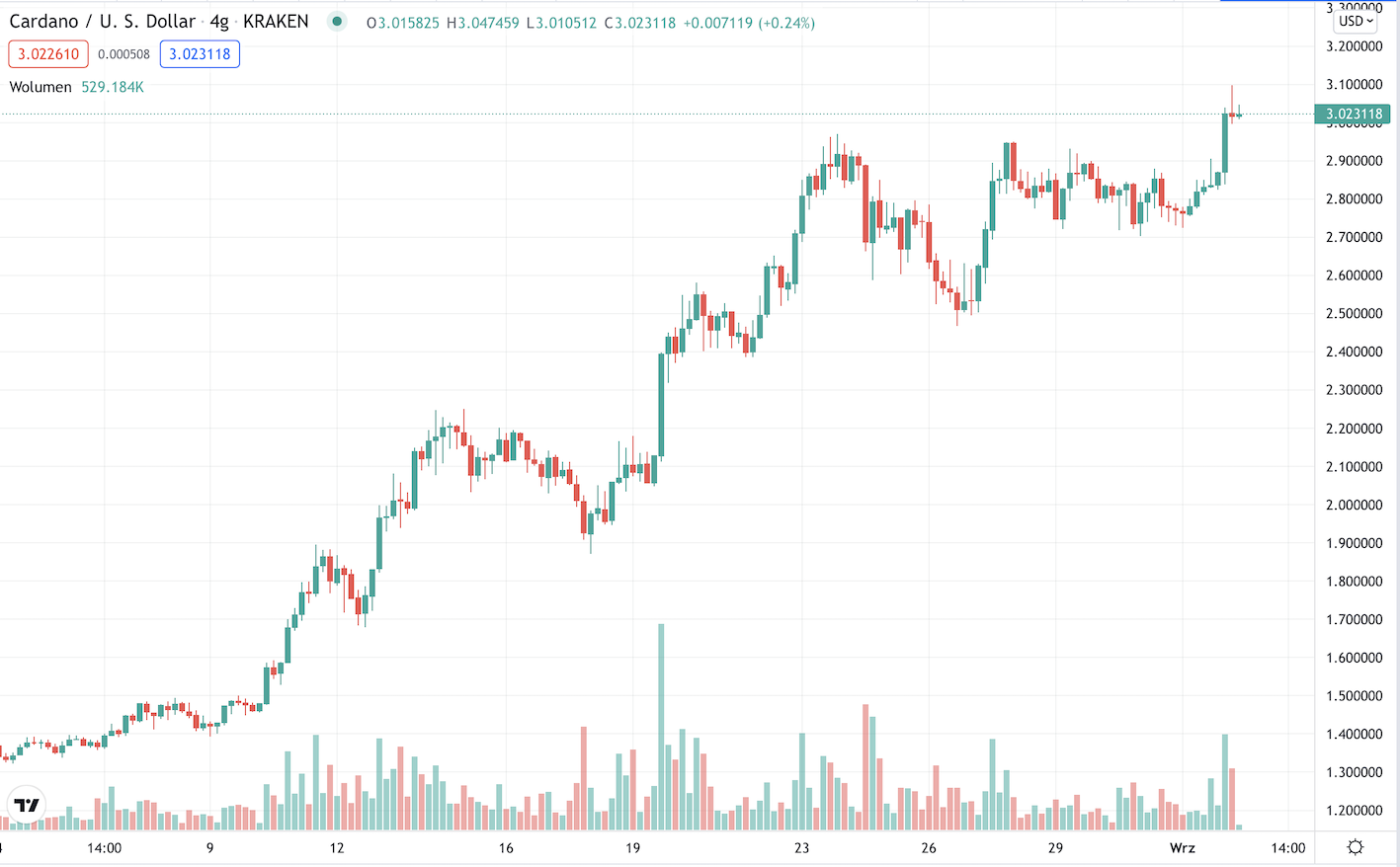 На момент написания ADA торгуется около $3.03. Максимум был установлен на отметке $3.10. За последние 24 часа цена токена выросла на 10%.