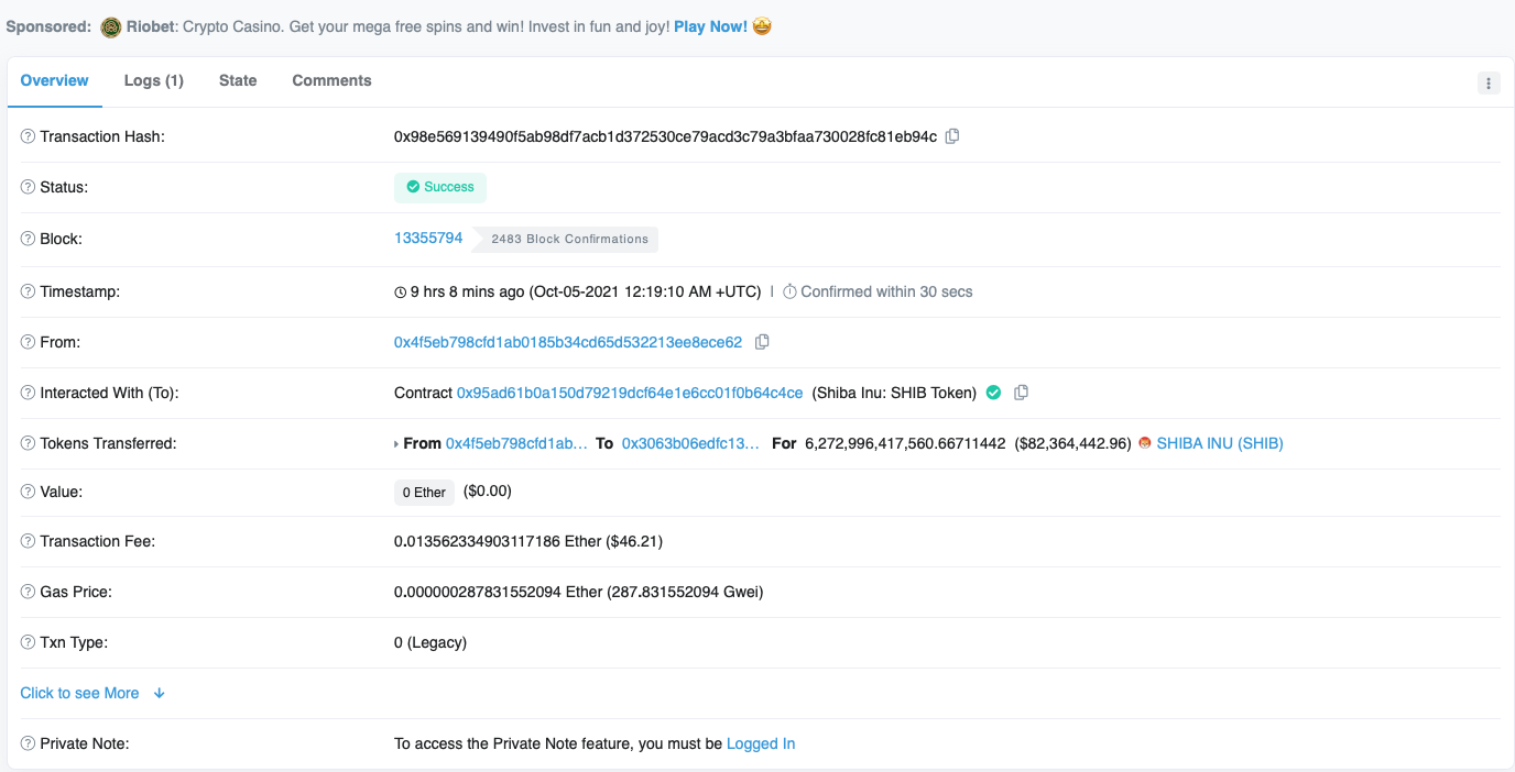 Стремительным взлетом мема воспользовался крупный держатель монеты. Приобретенные в конце сентября 6,1 трлн монет Shiba неизвестный кит перевел на новый адрес с комиссией всего $83. Оценивающиеся в $43,8 млн активы теперь стоят $83 млн.