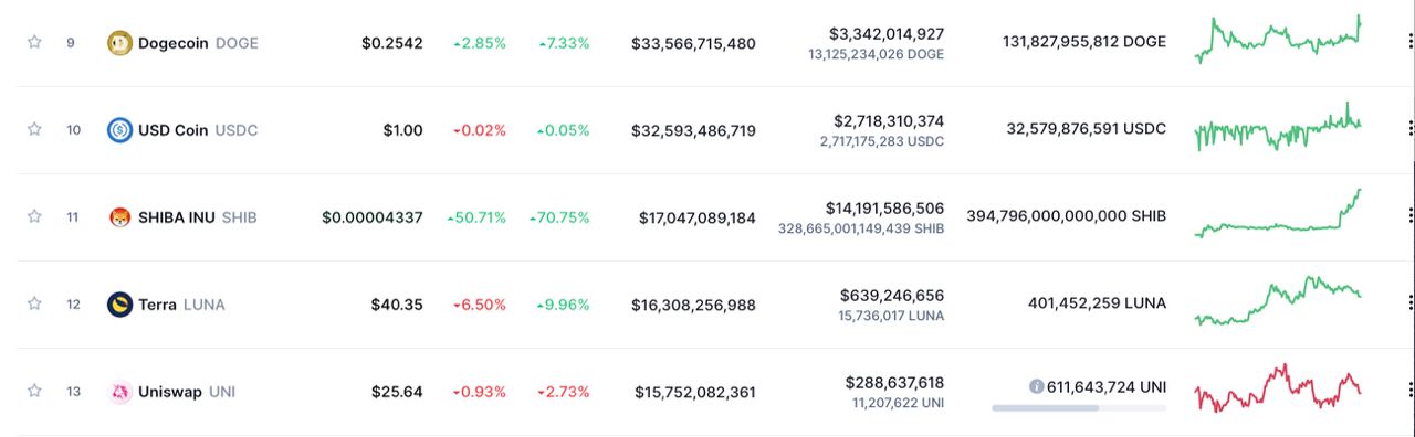 SHIB в очередной раз удивила рынок резким скачком на 50% за сутки. Токен торгуется на уровне 0,00004027 доллара, в то время как его рыночная капитализация в превысила Litecoin, Chainlink и Uniswap.