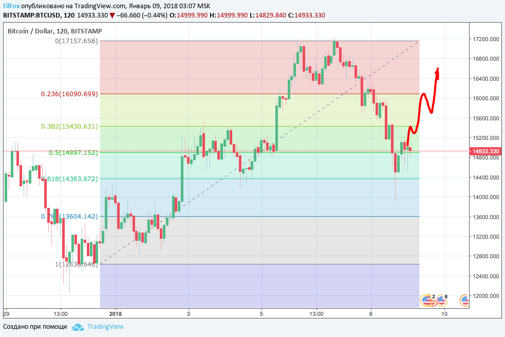 Возможно коррекция закончилась и цена по битку начнет восстанавливаться, только есть небольшое сомнение насчет уровня поддержки 50%. Это информационный уровень, который, обычно, не является сильным уровнем поддержки цены. Скорее всего психологическим. На графике цена несколько раз отбивалась от него. Возможно, действительно, 9 января, коррекция закончится на 14600.00 USD и биток начнёт восстанавливаться к уровню цен на 16000.00 USD.