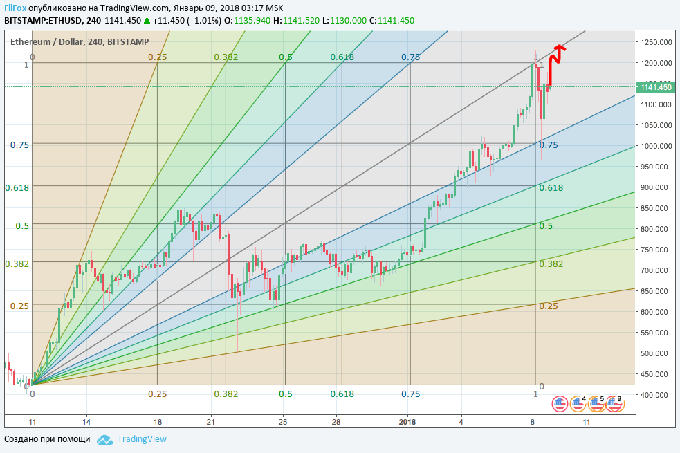 По эфиру всё идет по плану - цена обновила максимум на 1200.00 USD и после не глубокой коррекции продолжит рост. Ethereum по объёму капитализации набрал 110 млрд долларов США и смог потеснить Ripple на третье место. Полагаю, что 09.01.2018 произойдёт очередное обновление максимума в области 1300.00 USD.