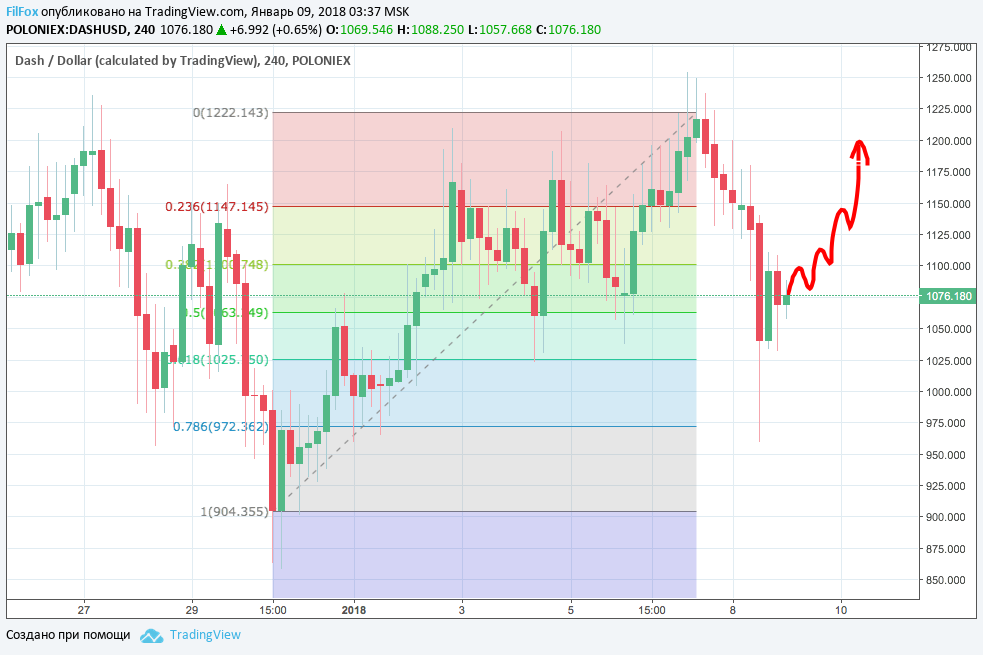 После того, как цена на DASH протестировала уровень поддержки 78.6% (970.00 USD), она так же быстро восстановилась в зелёную зону, к 50% уровню цен. Предполагаю, что целевой отметкой на 9 января будет зона 1200.00 USD