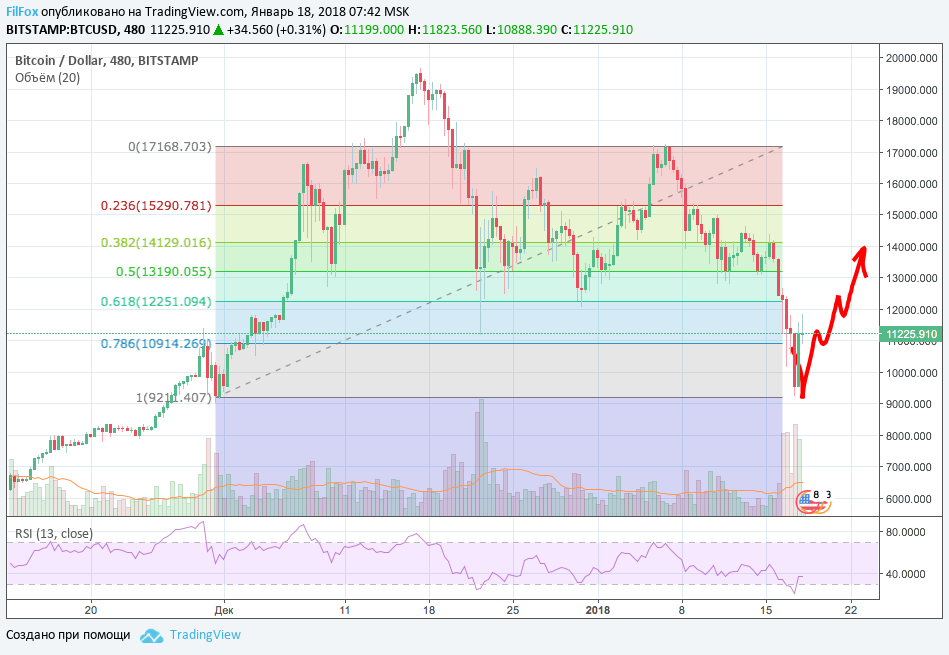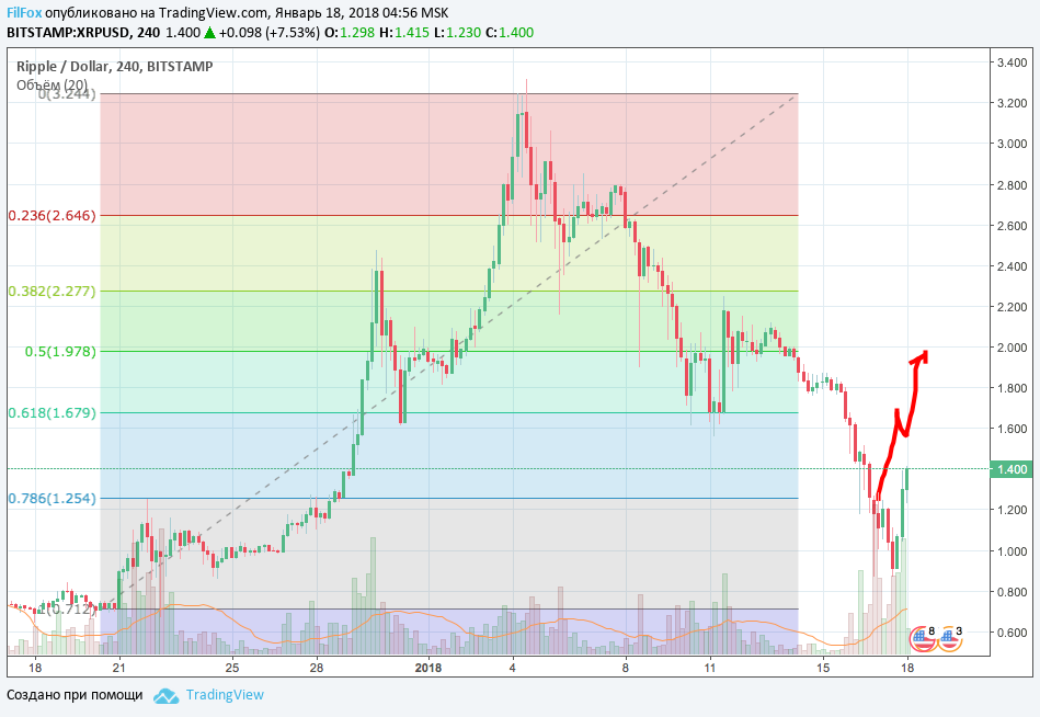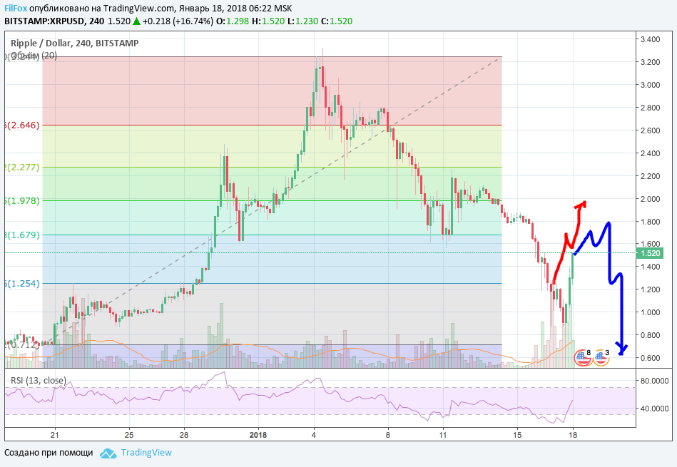 Немного по-другому посмотреть на данную ситуацию можно, если цена XRP/USD 18 января начнёт консолидироваться возле уровня 61.8% фибо и не сможет его преодолеть (как изображено синим на рисунке ниже).