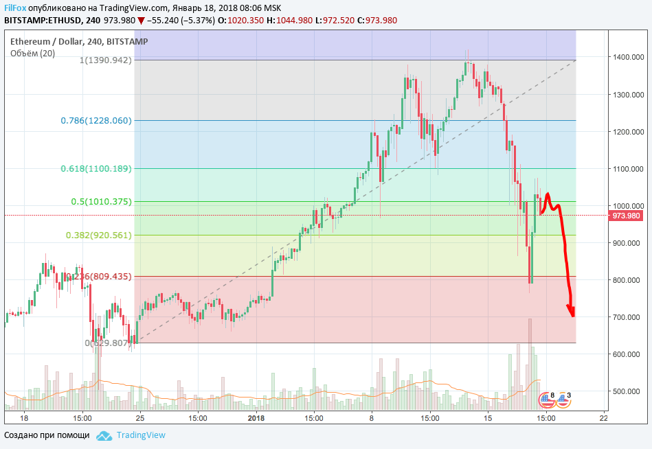 По Ethereum нужно признать, что о новом максимуме в области 1400.00 USD следует пока помолчать. На негативных фундаментальных новостях цена ETH/USD нарисовала даун-тренд с разворотом в точке 1384.78 USD. Зафиксировав минимум на отметке 761.61 USD, цена смогла восстановится до уровня тысяча долларов за эфир. Если на этом уровне продолжится консолидация, а не рост в область 1100.00 USD, то в дальнейшем выход из консолидации - это продолжение медвежьего настроения. Следует так же помнить о форке, назначенном на 19 января. Как будет вести себя эфир в преддверии этого события, точно спрогнозировать сложно. Можно предположить снижение область 700.00 USD.