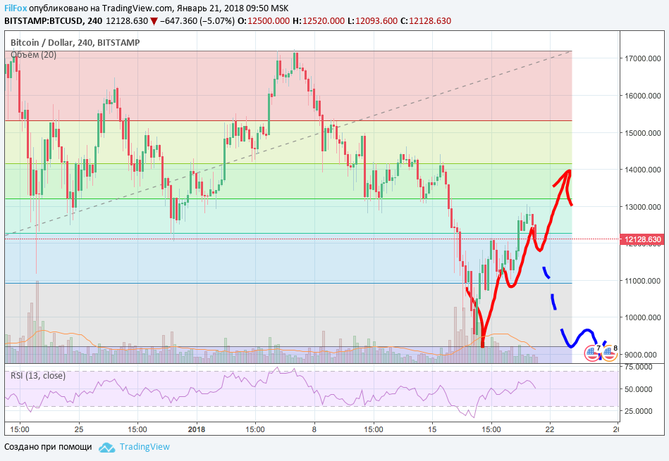 На рисунке мой позавчерашний прогноз, совмещенный с графиком цены BTC/USD на текущий момент (красным цветом я изображал наиболее вероятное событие, синяя прерывистая - наименее вероятное).