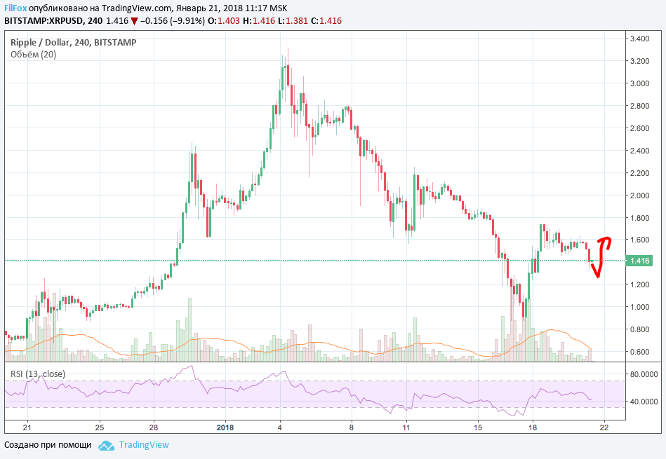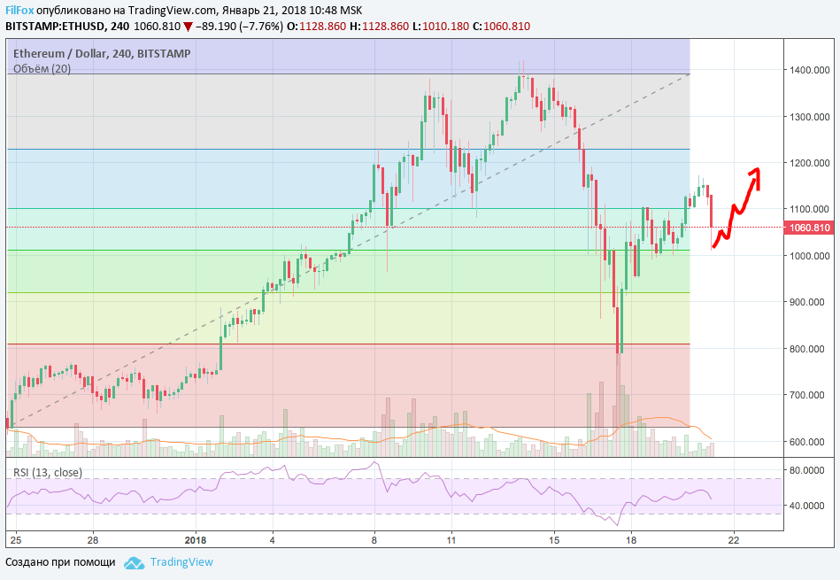 После глобального максимума 13 января на отметке 1420.00, USD цена должна была откатиться к уровню поддержки 78.6% фибо (1230.00 USD), но медвежий импульс «распродаж» сбил цену на эфир до 761.61 долларов США. Казалось, что цена летела в пропасть, но при этом соблюдая пятиволновую структуру Элиота. В конце пятой волны показатель RSI был в зоне перепроданности на огромных относительных объёмах. После этого эфир начали «скупать» по дешевке, пока цена не восстановилась в зону тысячи долларов. На текущий момент цена повторила ре-тест тысячной зоны и продолжит восстанавливаться к уровню 1200.00 USD долларов за эфир.