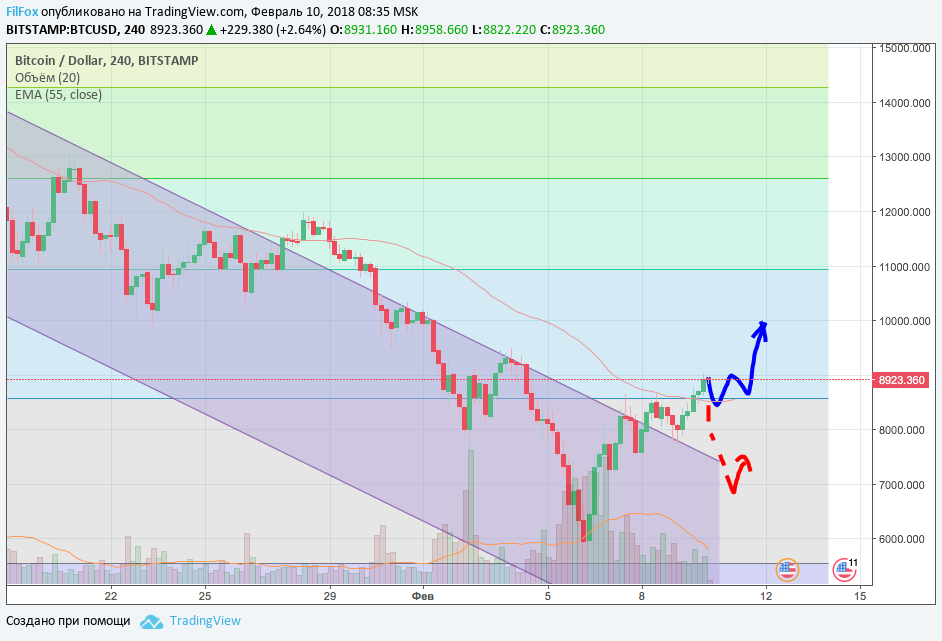 Давайте подытожим. Если коррекция начавшегося восходящего тренда произойдёт сегодня, то цена не сможет упасть ниже 5920.00 USD. Полагаю, что она ограничится уровнем 6500.00 USD. А если восходящий тренд продолжит развиваться, то целевым уровнем сможет послужить область десяти тысяч. Примерно на этом уровне располагается ЕМА 55 на двенадцатичасовом тайм-фрейме.