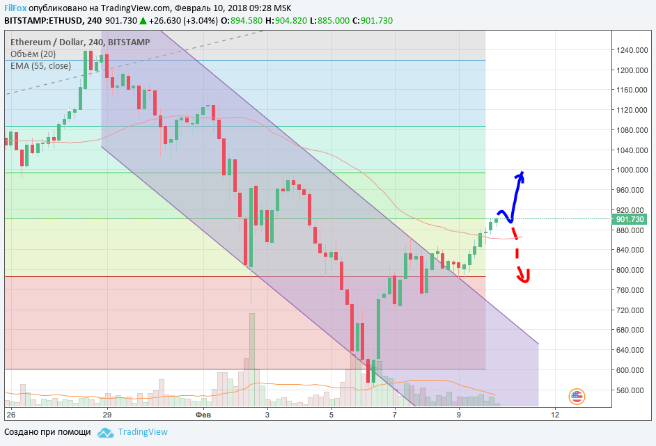 Ethereum вчера показал растущую динамику и тоже смог закрепиться выше уровня EMA 55. Если рынок не накроет коррекция, то сегодня ожидается рост к целевому уровню 1000.00 долларов за эфир. Если же импульсная волна восходящего тренда сменится корректирующей волной, то уровень поддержки 23.6% фибо (786.00 USD) замедлит снижение цены, которое будет направлено к уровню цен 640.00 USD