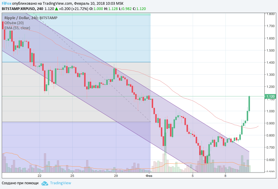 9 февраля Ripple вышел из узкого диапазона консолидации и демонстрирует уверенный рост. Цена уже преодолела отметку 1.00 USD и продолжает набирать обороты. Здесь тоже следует обратить внимание на средний объём сделок. Крупные участники рынка ещё не вступили в игру в ожидании коррекции.