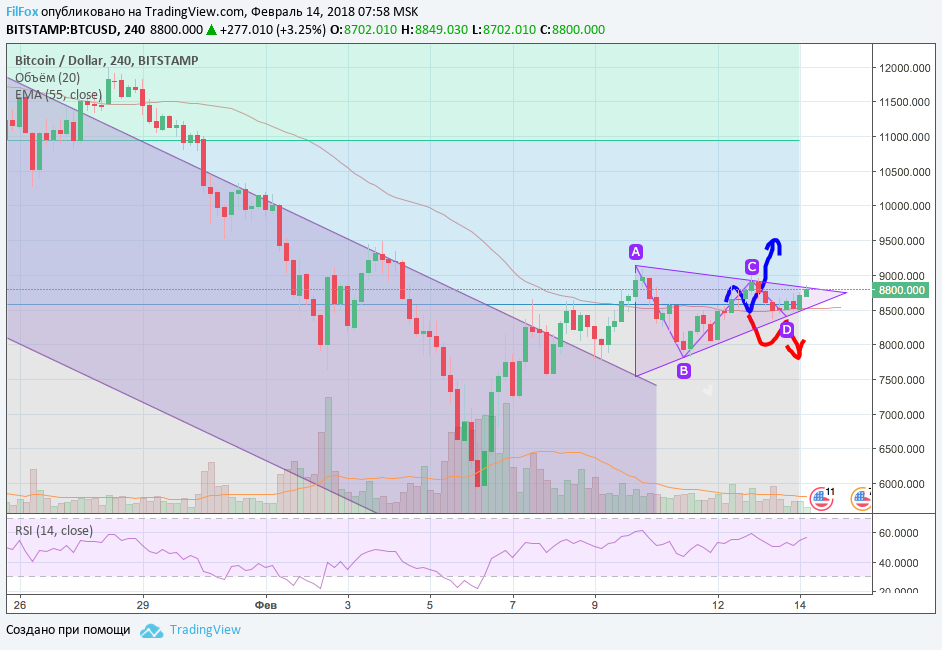 На графике цены BTC/USD можно увидеть графический паттерн «треугольник», биссектриса которого образует слабый бычий трамплин. Многие специалисты связывают консолидацию на рынке с предстоящей экспирацией фьючерсных контрактов на Чикагской фьючерсной бирже (CBOE), которая может вызвать снижение цены на базовый актив. Нейтральный новостной фон пока не даёт импульс для выхода цены из образовавшегося треугольника, хотя, судя по длине биссектрисы, в ближайшее время этот импульс сможет пробить верхнюю границу треугольника и цена достигнет области 9500.00 USD - 9800.00 USD.