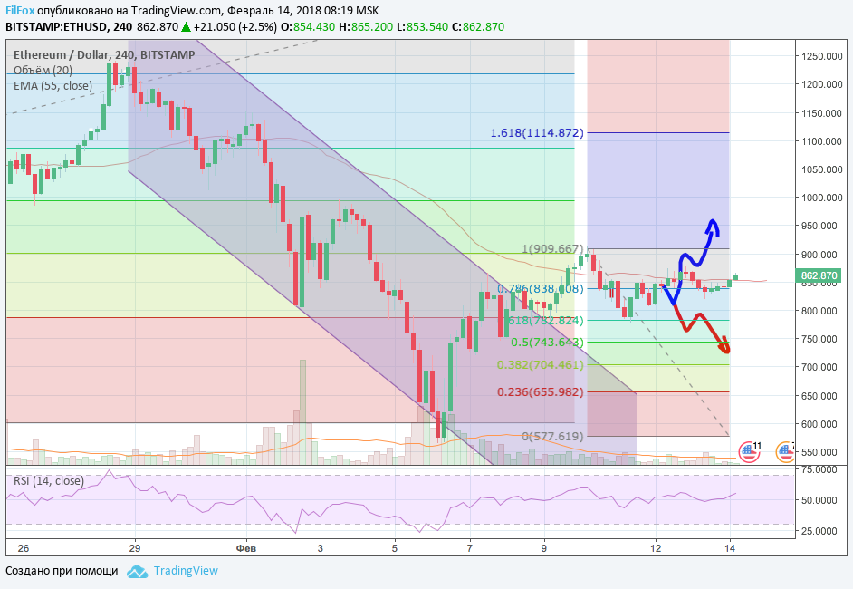 Ethereum 13 февраля консолидировался в узком боковом диапазоне, возле скользящей средней EMA55, которая находится на уровне 850.00 USD. Сегодня после получения сигнала о направлении импульса по криптовалютной паре BTC/USD цена на эфир последует за биткоином. Ориентировочный уровень цен при восходящем импульсе составит 950.00 - 1000.00 долларов за эфир. Нисходящий импульс, который пока считается менее вероятным, отправит цену к отметке 750.00 USD.