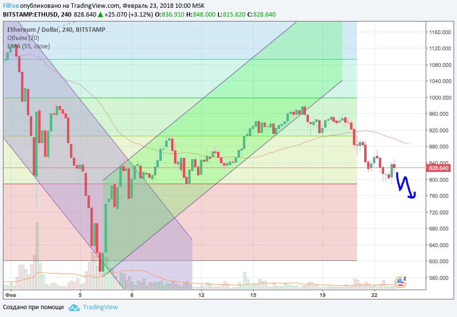 По Ethereum картинка не выглядит так драматично, как по Bitcoin. Уровень поддержки 23.6% фибо (788.00 USD) выступил вчера ограничителем сползания цены, и эфир восстановился до отметки 848.00 USD. Но полагаю, что сегодня цена всё таки пробьёт этот уровень поддержки и нацелится на минимум в области 750.00 долларов за эфир.