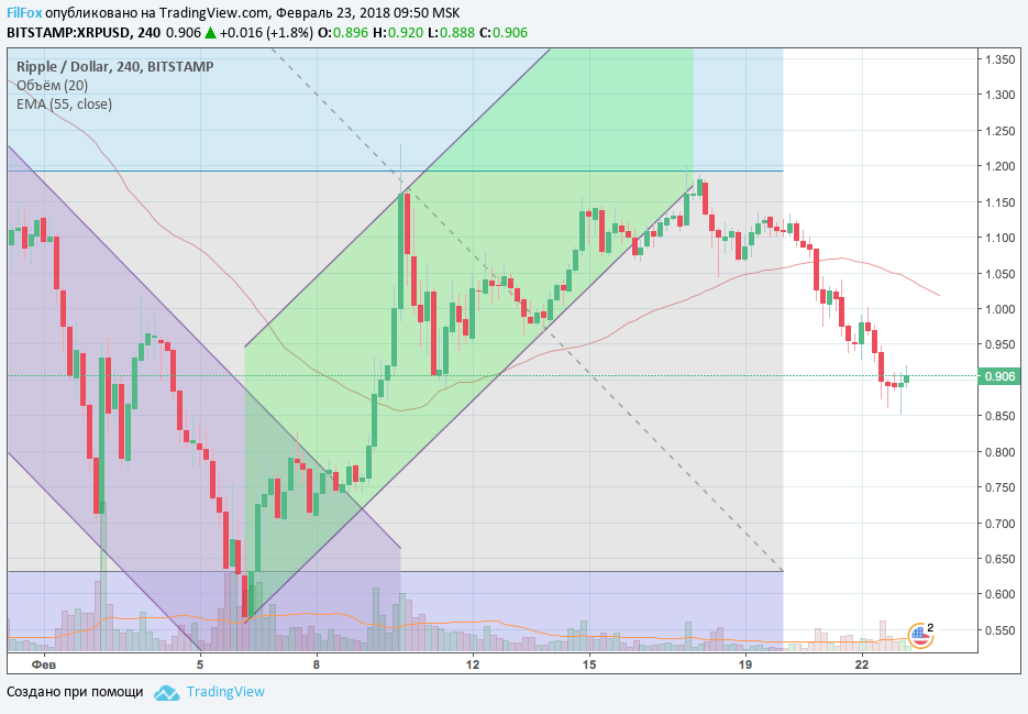 Цена на Ripple протестировала, вчера, уровень поддержки 0.900 USD, но потом смогла восстановиться выше этого уровня поддержки. Однако, сегодня, этот уровень будет пробит и цена опустится до уровня 0.787 USD. Если же на протяжении дня Bitcoin продемонстрирует уверенное восстановление, то цена XRP/USD сможет достичь психологического уровня один доллар за рипл.