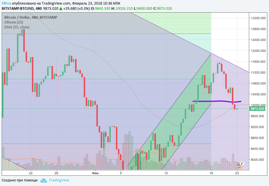 Если же взглянуть на дневной тайм-фрейм, то можно заметить, что рост цены Bitcoin, который начался 6 февраля от минимума 5 920.00 USD и достиг максимума на отметке 11 780.00 USD, проходил в рамках нисходящего фиолетового коридора, и является коррекцией нисходящего тренда, который начался 17 декабря 2017 года, падением Bitcoin с вершины, примерно 20 000.00 USD. В этом случае цена на Bitcoin упадёт ниже предыдущего минимума 5 920.00 USD.
