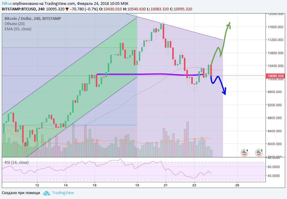 Второй вариант (зелёный, менее вероятный). Цена начнёт восстанавливаться, преодолевая сопротивление на уровне 10400.00 USD, затем 10800.00 USD и тестит верхнюю границу фиолетового коридора. Возможно, что с первого раза цена не сможет преодолеть эту границу, которая находится на уровне 11100.00 USD, но если она будет преодолена, то вполне возможно обновление недельного максимума 11 780.00 USD. Конечно мы понимаем, что это сценарий не одного дня, но если он реализуется, то произойдёт отмена падения цены в рамках глобального нисходящего (фиолетового) коридора.