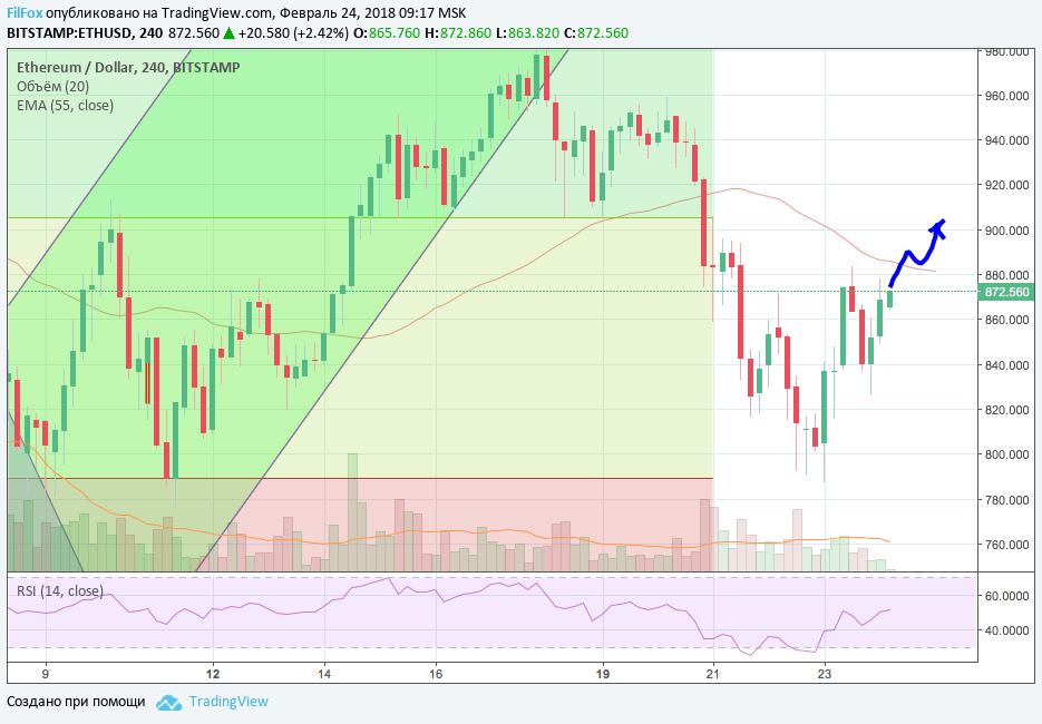 Etereum вчера, на уровне 23.6% фибо (788.00 USD) встретил поддержку, и установив дневной минимум на отметке 787.00 USD начал восстанавливаться.Сегодня, преодолевая сопротивление скользящей средней EMA 55, восстановление продолжится к уровню 38.2% фибо (905.00 USD).