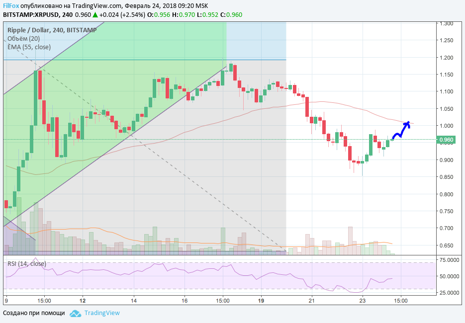 Ripple сегодня попытается восстановится к своему психологическому уровню один доллар за рипл. Но такое восстановление будет невозможным, если пара BTC/USD будет весь день снижаться. Тогда и цена на рипл будет искать поддержку на уровне 0.900 USD.