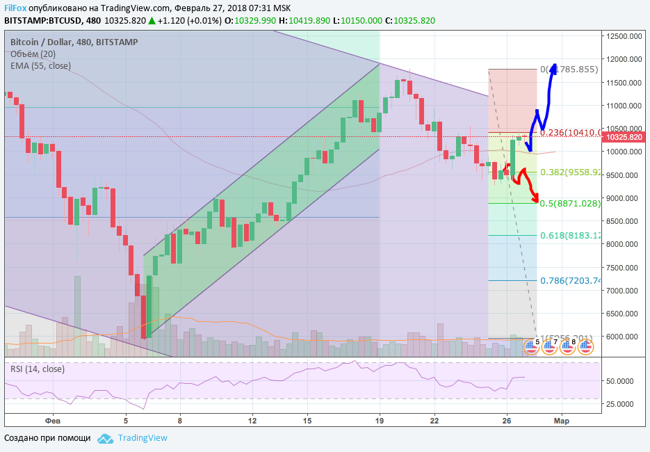 Поэтому сценарий, обозначенный синей стрелкой, довольно вероятен, но медведи утверждают, что данный бычий импульс выглядит не убедительно, и сегодня, цена BTC/USD вновь сдаст позиции «Десять тысяч долларов», опустившись до уровня поддержки 50% фибоначи (8 871.00 USD). Не исключено, что в диапазоне 10 000.00 USD - 9 558.00 USD развернётся настоящая борьба за возможность консолидировать цену в боковом коридоре, но по нашему мнению быки временно уступят свои позиции.