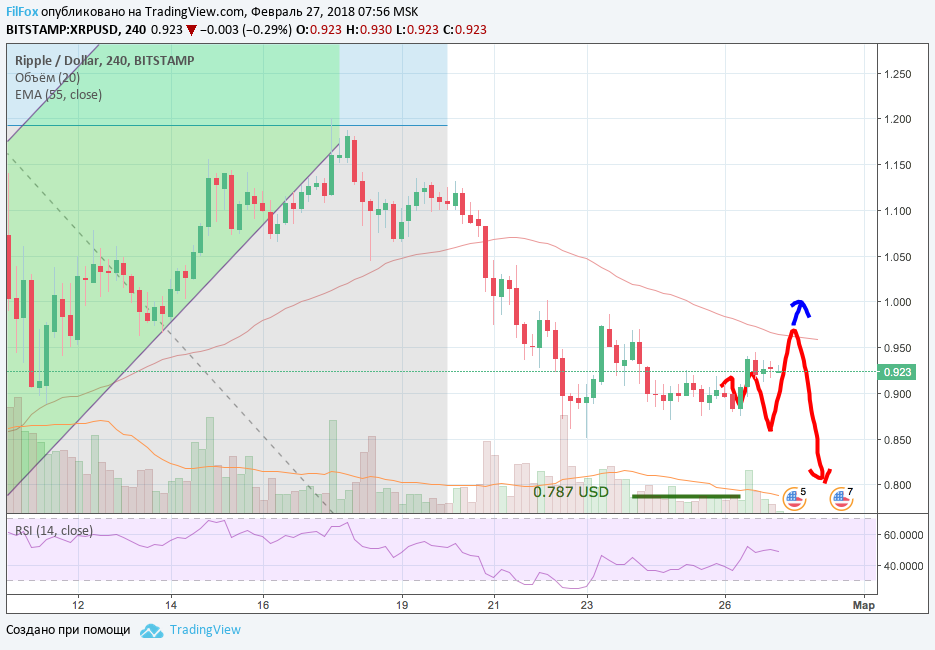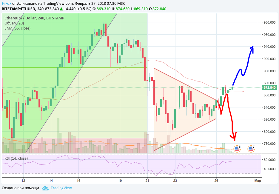 Воодущевлённые вчерашним ростом Bitcoin, остальные криптовалютные пары, тоже, последовали за флагманом. Ethereum, вчера, пробил верхнюю границу треугольника и смог закрепиться выше уровня скользящей средней EMA55. И если Bitcoin и сегодня будет демонстрировать рост, то курс эфира сможет преодолеть сопротивление 38.2% фибо (905. 00 USD) и восстановится до уровня 940.00 USD. В противном случае, реализуется вчерашний сценарий, в соответствии с красной стрелкой.