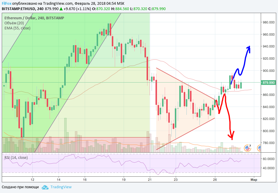 Если Bitcoin, продолжит наращивать курс, то эфир сегодня преодолеет этот уровень сопротивления, постепенно следуя к «заветной цели», в направлении синей стрелки. Быки будут удовлетворены и боковым движением цены, только если оно будет происходить выше уровня сопротивления 38,2% фибоначи. Падение цены ниже уровня скользящей средней EMA 55 сегодня маловероятно, но возможно при падении курса Bitcoin.