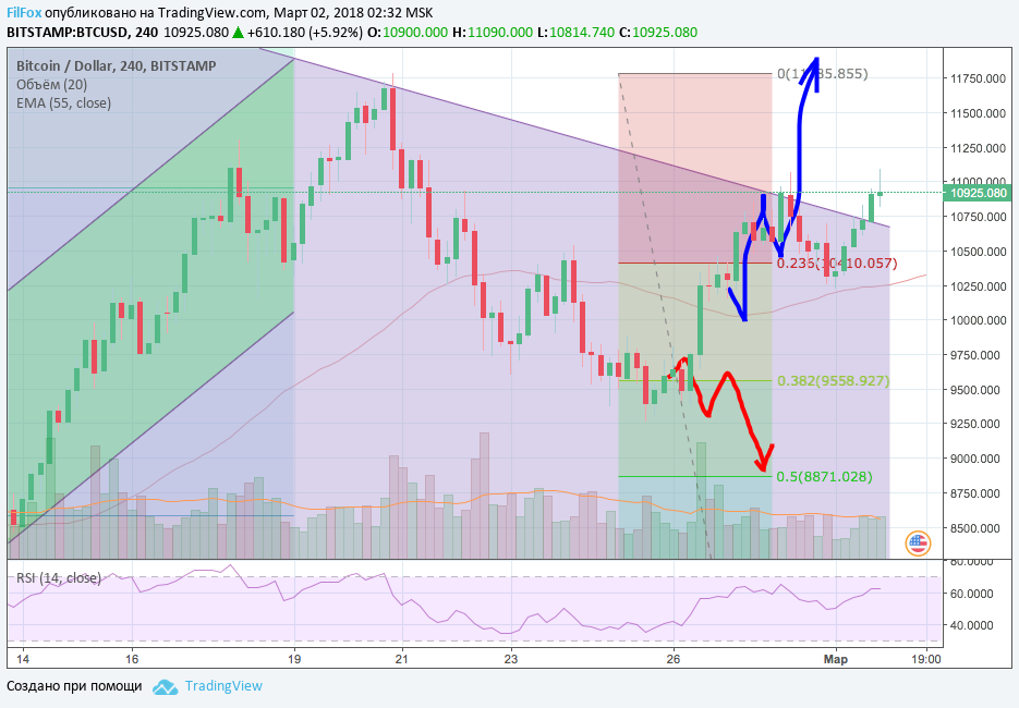Если же сегодня произойдёт снижение курса к уровню поддержки 23.6% фибоначи (10 410.00 USD), то нужно быть готовым к тому, что цена пробьёт этот уровень и будет искать более надёжную поддержку. В этом случае курс Bitcoin может просесть к уровню поддержки 38.2% фибо (9 558.00 USD)