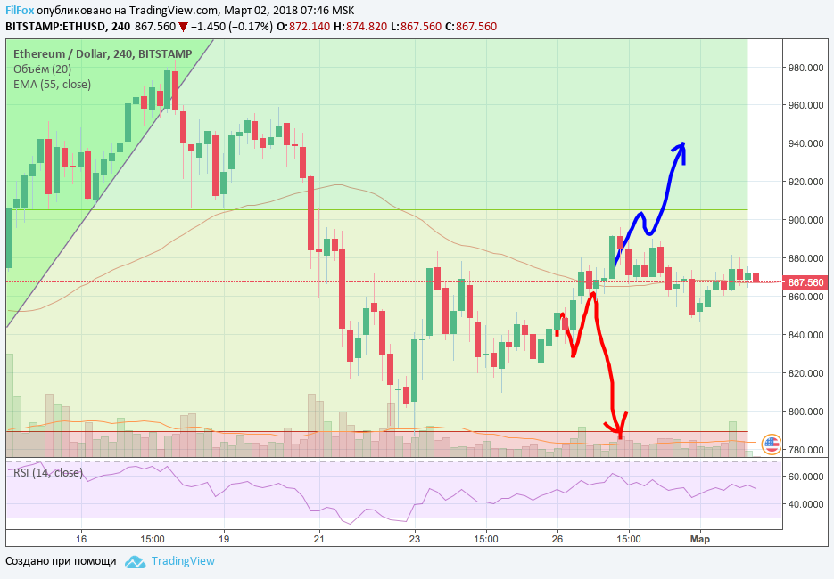 На фоне вчерашнего роста курса Bitcoin, эфир смог восстановится к уровню поддержки, которым выступает скользящая средняя EMA 55. Сегодня при положительной динамике пары BTC/USD, цена на Ethereum вновь может протестировать область максимумов 21 февраля. Напомню, что тогда цена установила дневной максимум на отметке 906.00 USD, но закрепиться выше уровня сопротивления 38.2% фибо (905. 00 USD) так и не удалось. Поможет ли биткоин сегодня цене эфира закрепится выше этого уровня, - мы узнаем во второй половине дня.