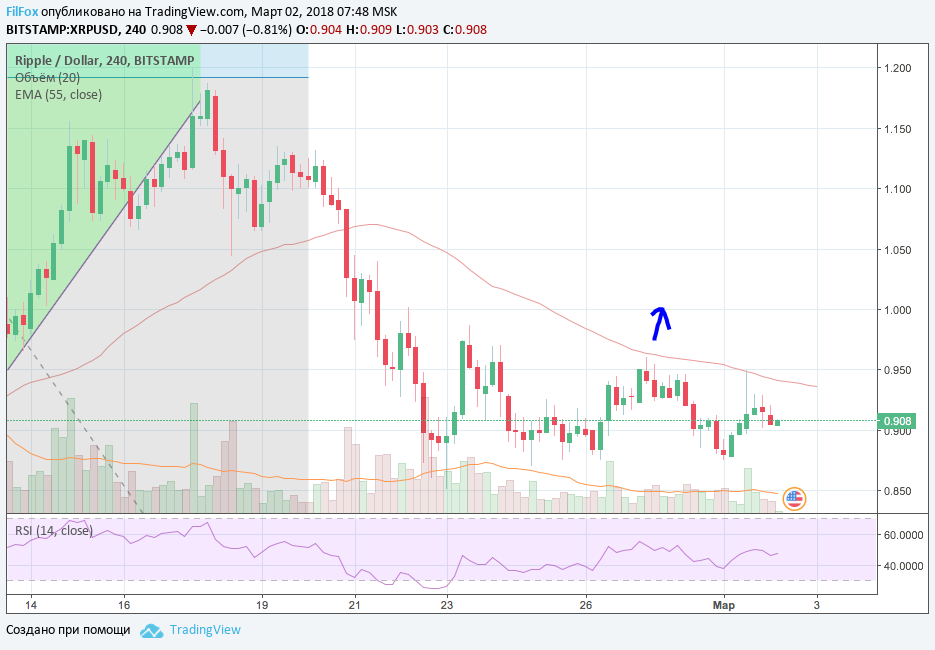 Ripple вчера лениво протестировал уровень сопротивления ЕМА 55 и вновь вернулся к своему равновесному состоянию на уровне 0.905 USD, которое он нащупал на прошлой неделе, 23 февраля. Похоже, что рипл не собирается воевать за новые максимумы, а решил отлежаться на боку, пока быки и медведи выяснят кто сильнее на графике цены Bitcoin.