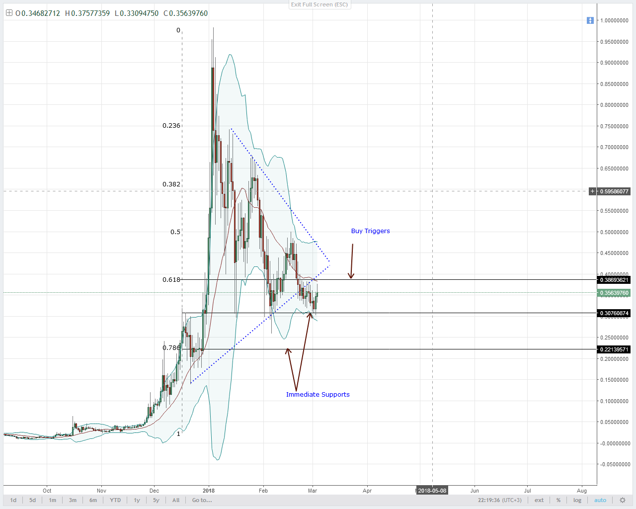 Это именно то, что нам нужно и это то, что вполне вероятно может произойти. Когда это произойдет, мы должны тщательно настроить входы на вторник 6го февраля, и покупать на провалах, на часовом тайм-фрейме, или же на уровне ре-теста $0.35-$0.38.