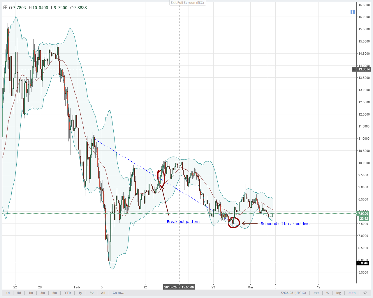 Мне кажется, позиционным трейдерам придется подождать, чтобы увидеть поднимутся ли цены выше. Если поднимутся, и это продолжится до 6го марта, они могут начинать искать длинные входы с каждым ре-тестом средней BB на отметке 9$ в четырехчасовом тайм-фрейме.