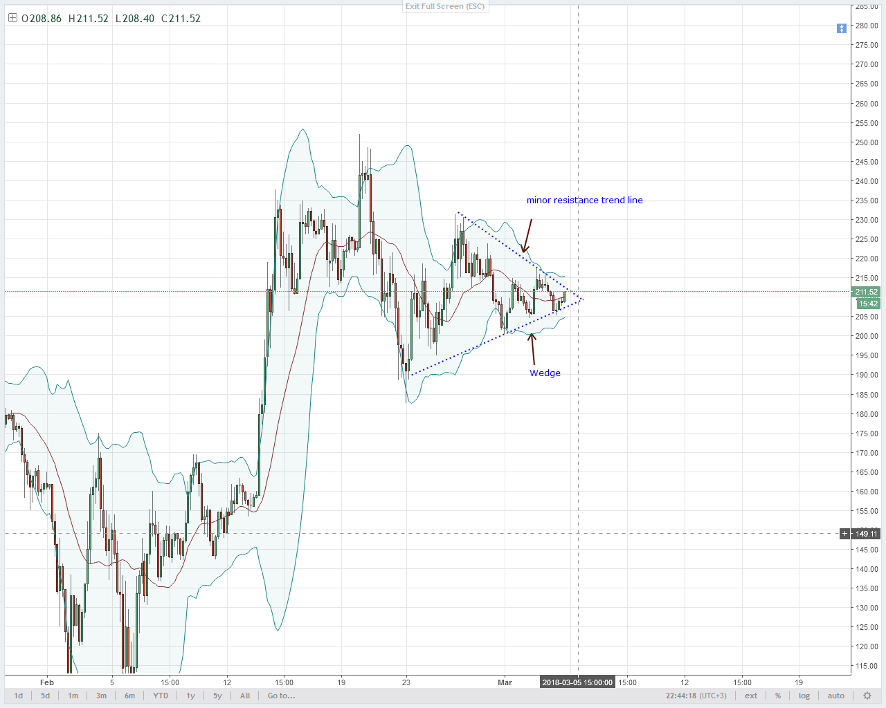 Для разъяснений мы заглянем в четырехчасовой тайм-фрейм. Там мы видим, что цены двигаются в пределах треугольника, с сильной поддержкой на малой линии поддержки. Мы должны увидеть рост выше $225 в ближайших сессиях для того, чтобы мы могли сказать, что покупатели подняли цены. Если этого не случится, и продавцы продолжат медвежье давление, тогда главная линия поддержки совсем скоро может оказаться на отметке $180.