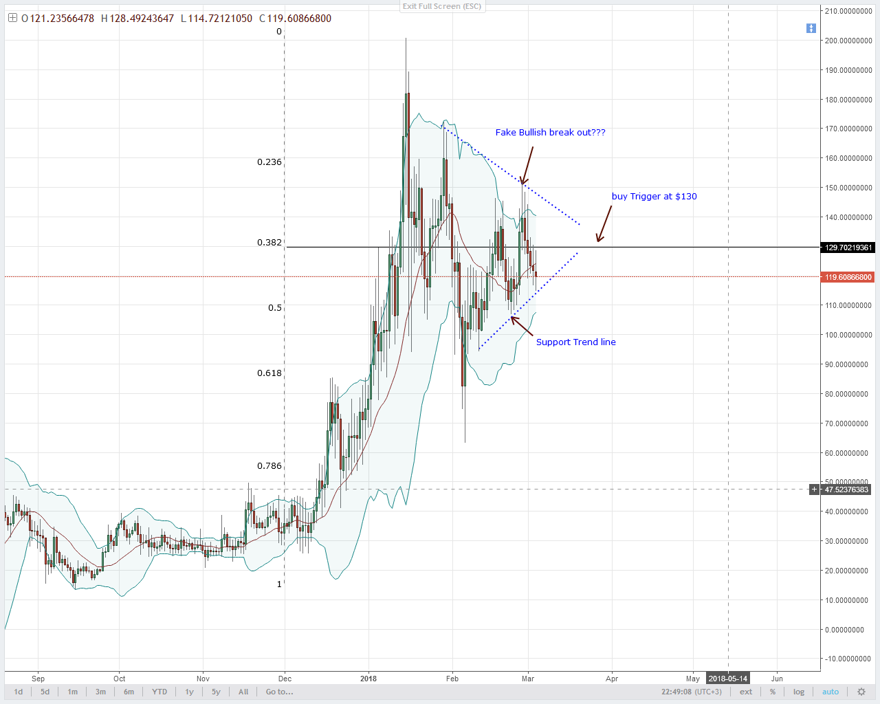 На дневном тайм-фрейме мы можем видеть двойную разворотную свечу возле линии поддержки. На мой взгляд, можно порекомендовать длинные или короткие входы на отметках выше $140 или же ниже $100. До тех пор я бы оставался нейтральным.