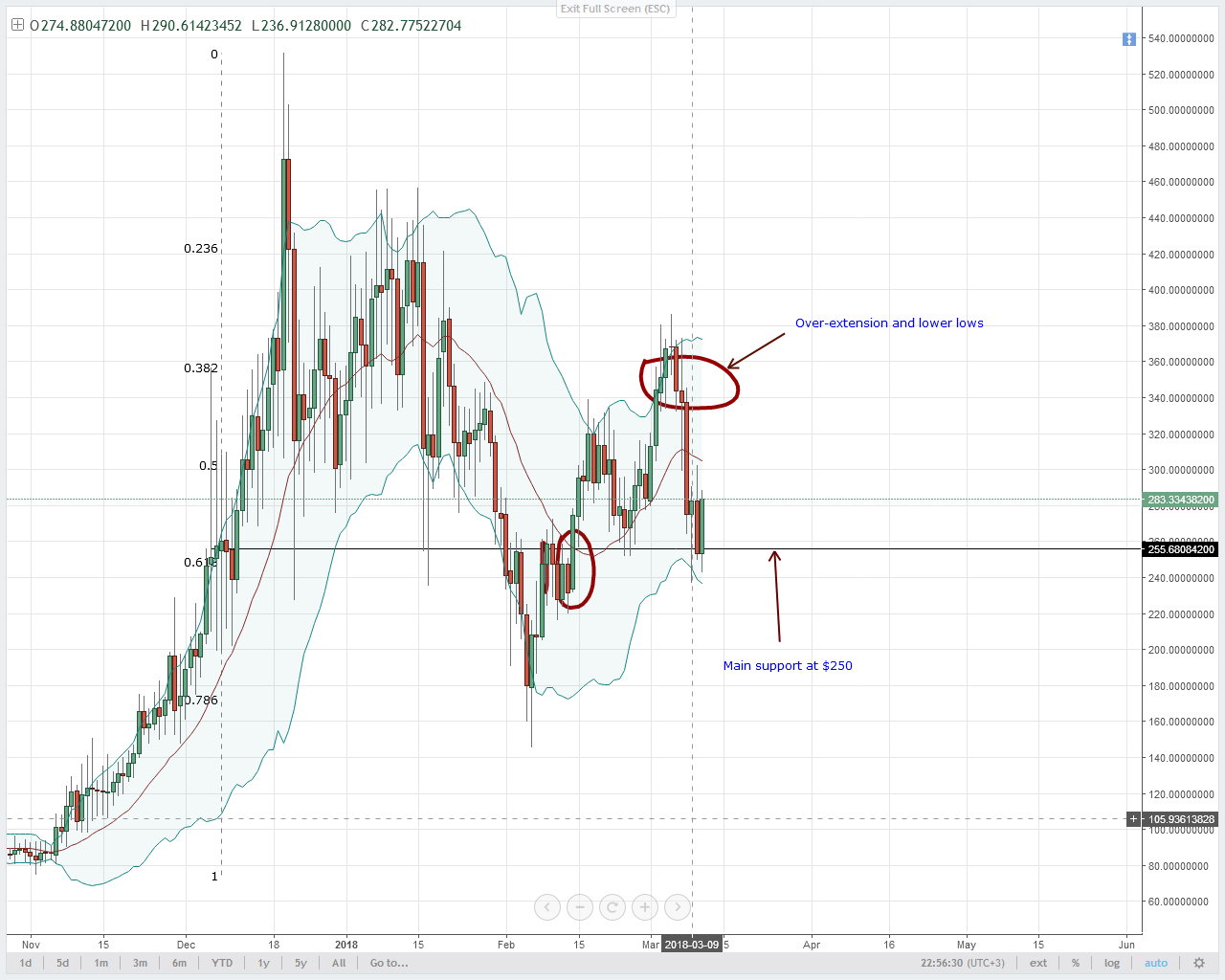 После ценовых движений 10 марта мы ожидали, что покупатели поднимут цены EOS, восстановив цену после провала 9 марта. Этого не случилось, однако все еще высоки шансы того, что цены восстановятся в ближайших сессиях.