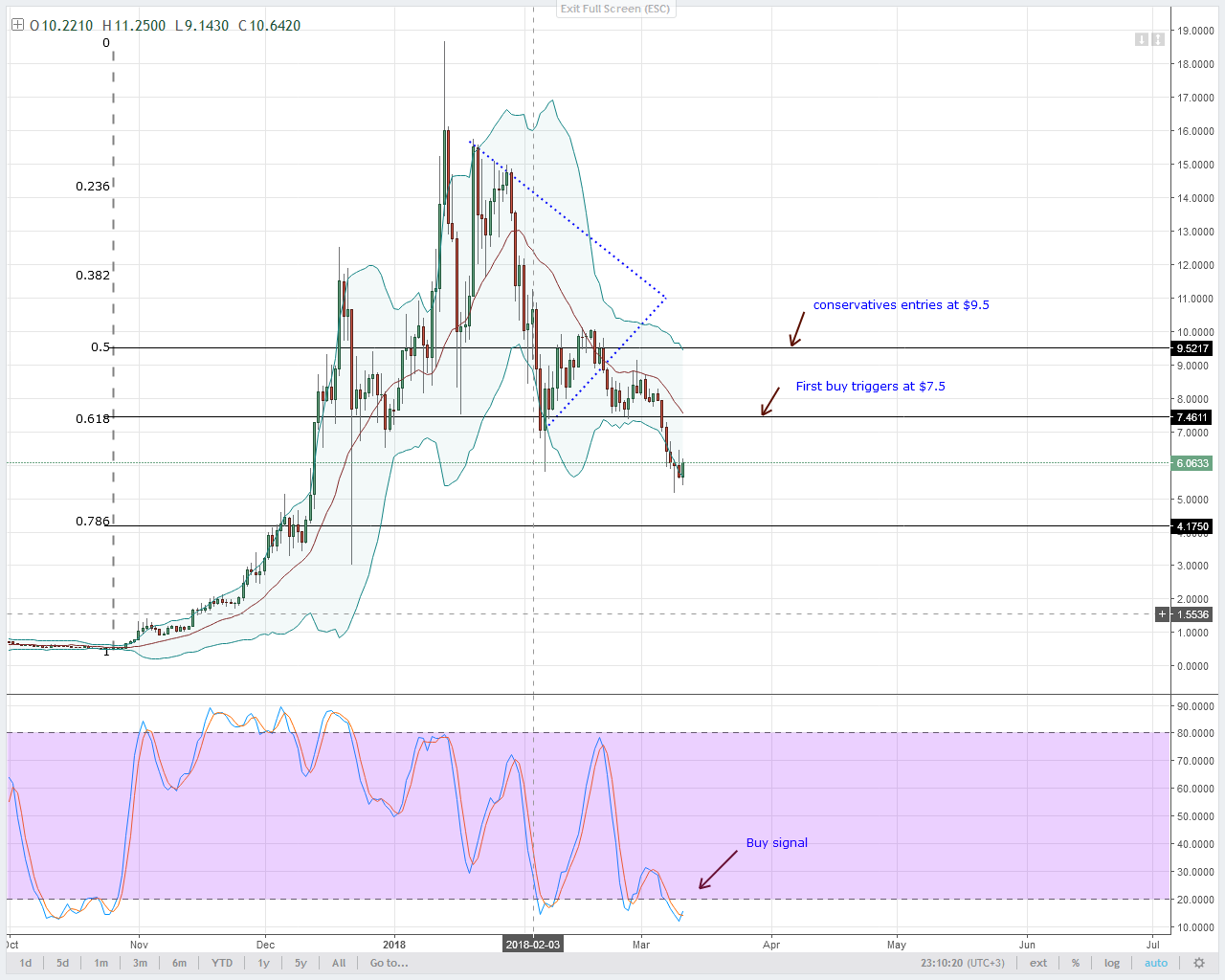 C другой стороны, консерваторам стоит ожидать бычьего подтверждения на уровне $9.5. 50% фибоначчи и средняя BB $7.5 может послужить первым уровнем бычьего триггера.
