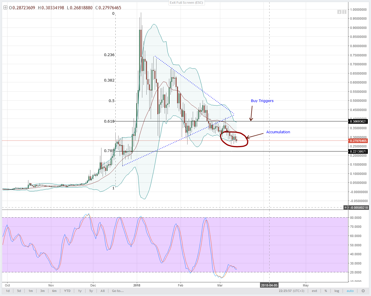 На мой взгляд, цены по-прежнему могут идти двумя путями. Или покупатели начинают поднимать цену, развивая бычий импульс, или продавцы все-таки продавят цену ниже $0.20.