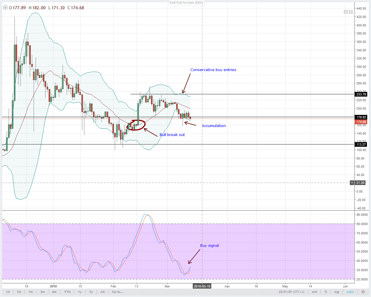 Во-первых, мы будем использовать максимум и минимум 9 марта на отметках в $190 и $155 в качестве наших уровней сопротивления и поддержки, поскольку цены колеблются в пределах $180. Если случится прорыв ниже $155 сегодня, мы отменяем наш бычий прогноз.