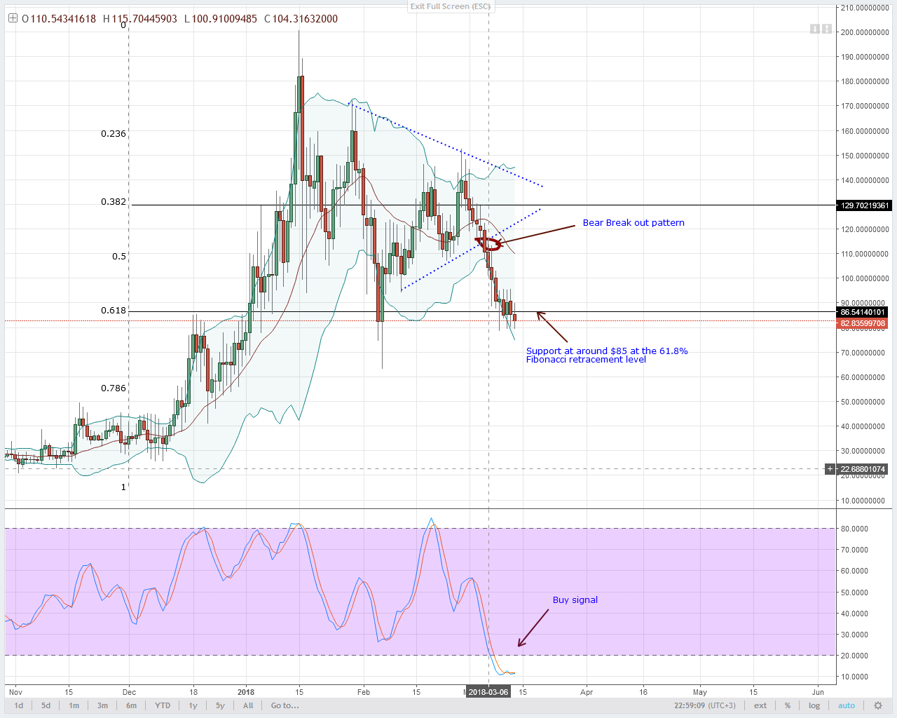 Ценовые движения NEO выглядят очень интересно. Не только продавцы тестируют уровни поддержки на недельном тайм-фрейме, но и сигнал на покупку на дневном тайм-фрейме может поднять цену выше $90. С другой стороны, продавцы могут продавить цены еще ниже до отметки $55.