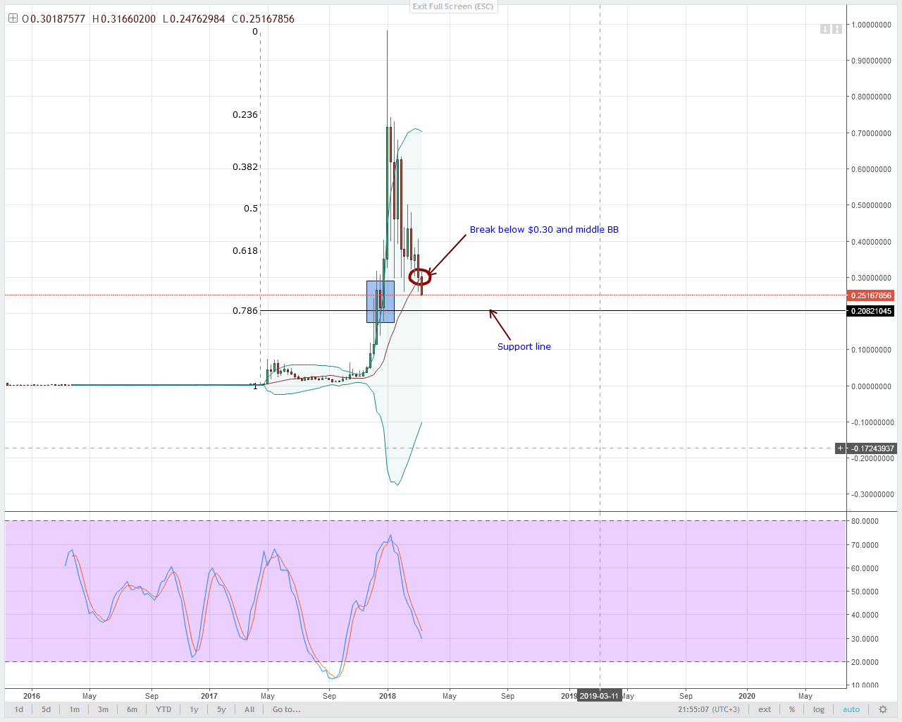 Обвал цен альткоинов потянет за собой и цены на NEM, поэтому я придерживаюсь медвежьей стратегии, несмотря на 15% рост цены 12-13 марта. Любое закрытие ниже отметки $0.25 станет подтверждением медвежьего давления.
